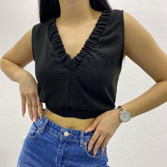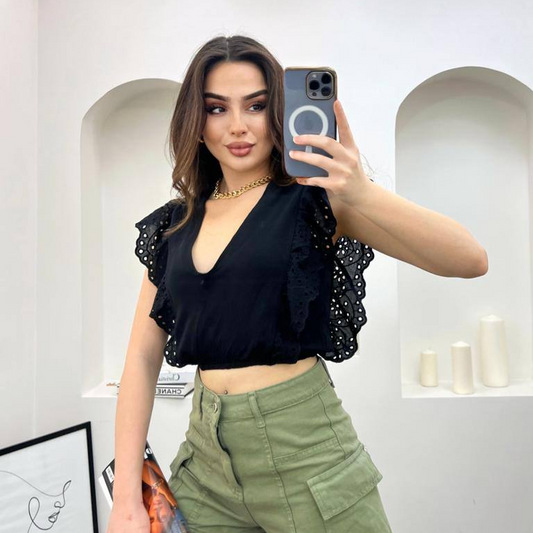 Women's V Neck Guipure Sleeve Detail Crop Blouse - BL00004