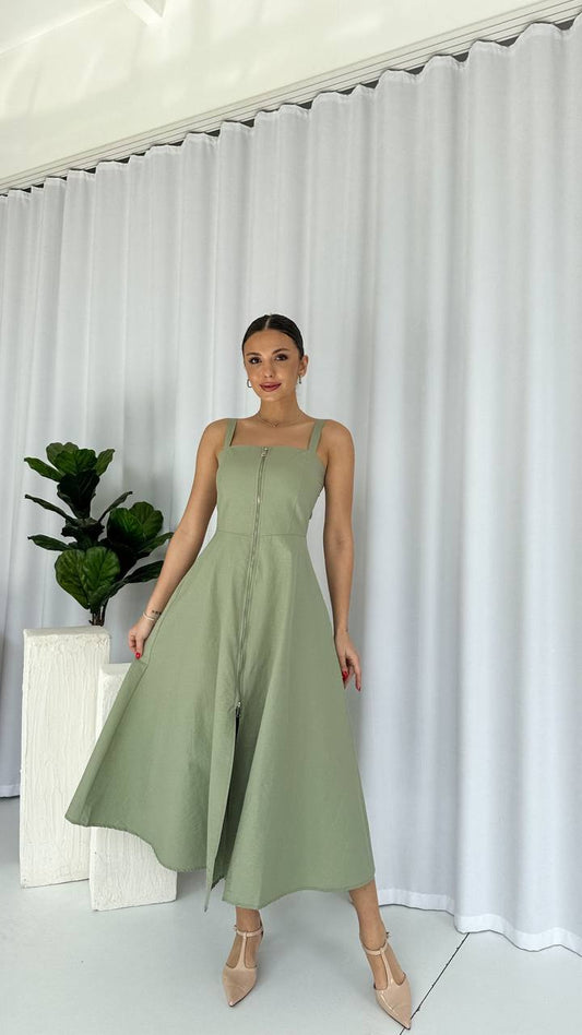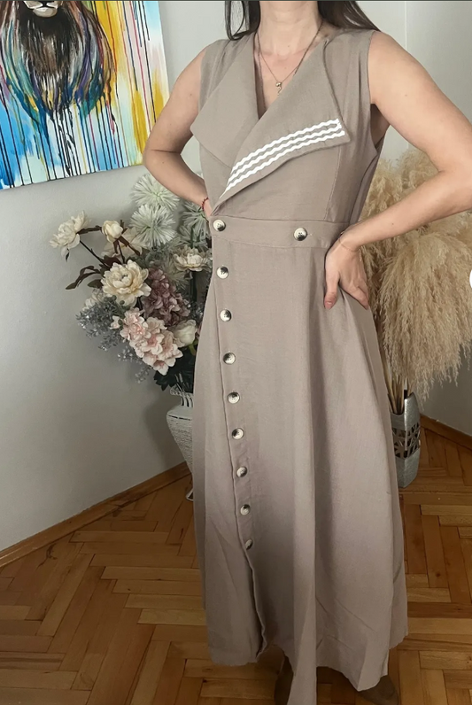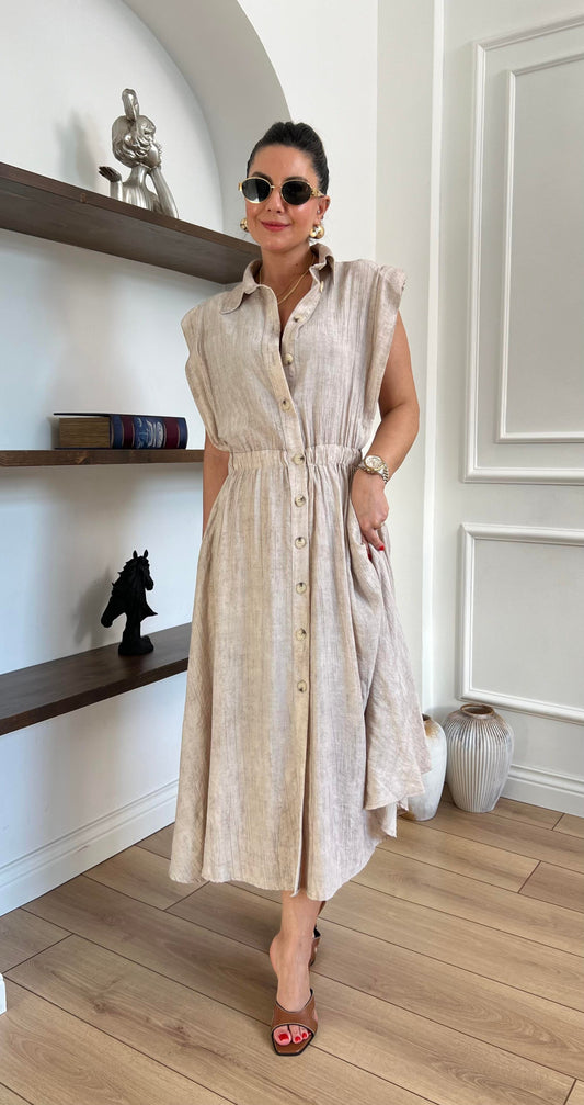 Linen Dress with Elastic Waist and Button-Down Front - 00153