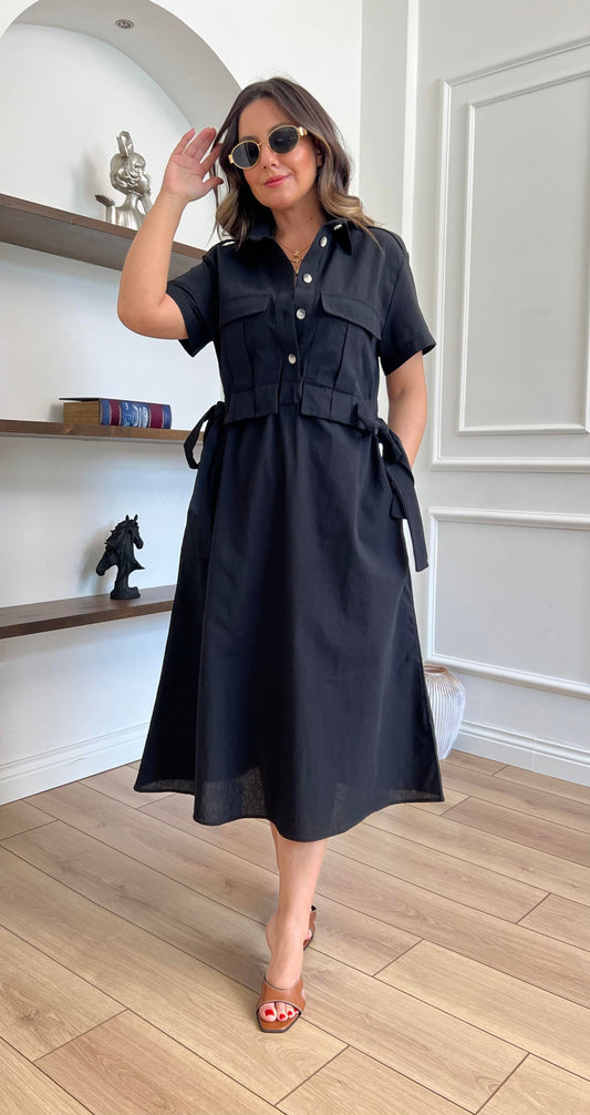 Belted Linen Cargo Pocket Midi Dress - 00158