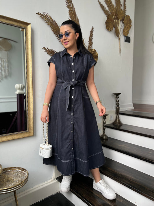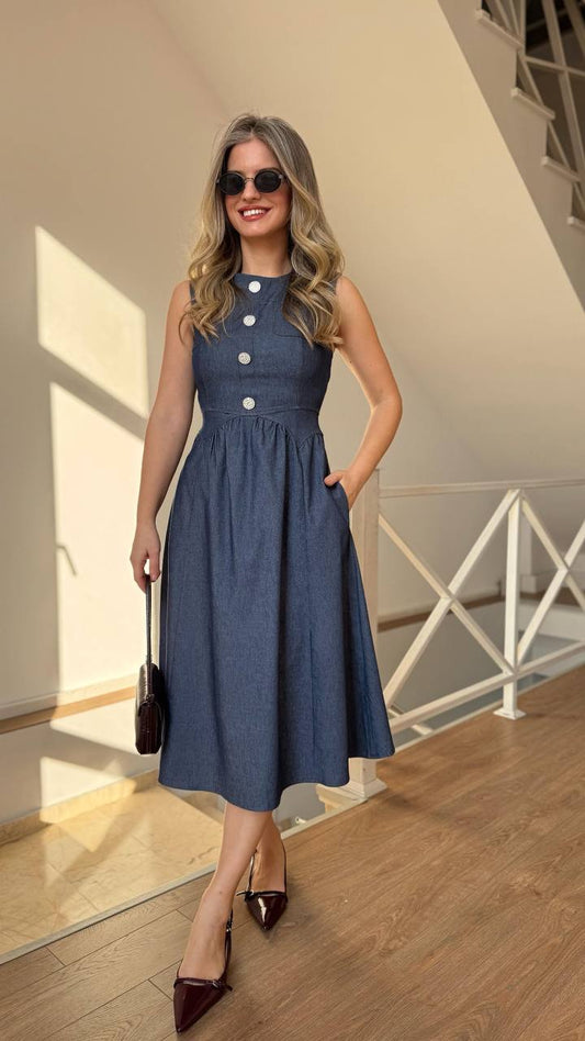 Sleeveless Denim Midi Dress with Crystal Buttons - 00155