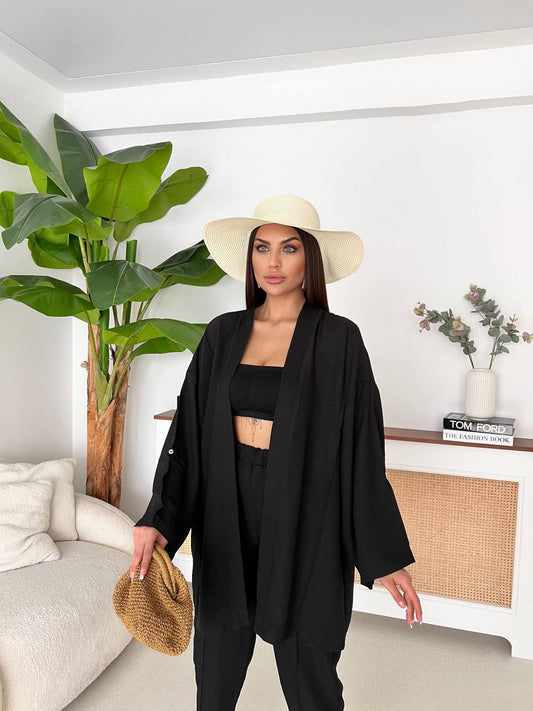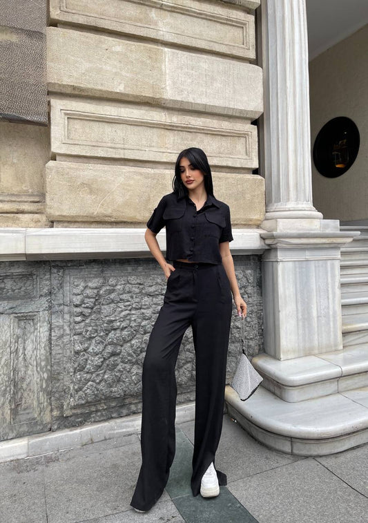 LINEN FABRIC CROP SHIRT, STRAPPED BACK BUSTIER AND PALAZZO TROUSERS THREE-Piece SET - TK00069