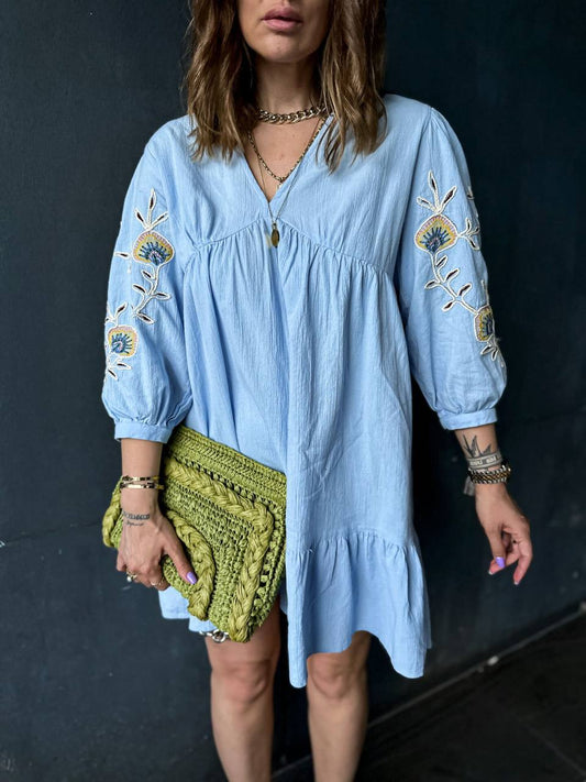 Blue Linen Dress with Embroidered Sleeves - 00077