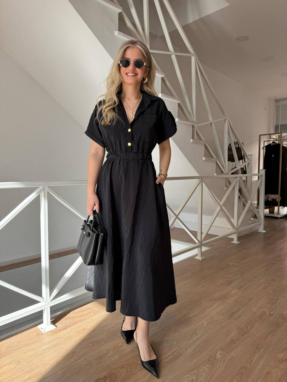 This elegant maxi shirt dress is your go-to piece for timeless style and effortless comfort. Crafted from lightweight, subtly textured fabric, it features short cuffed sleeves, a button-up front, and an elastic waistband that cinches at the waist for a flattering silhouette. The classic collar and chest pockets add a structured touch, while the flowy skirt enhances movement and grace. Available in five versatile shades to match your mood and style.